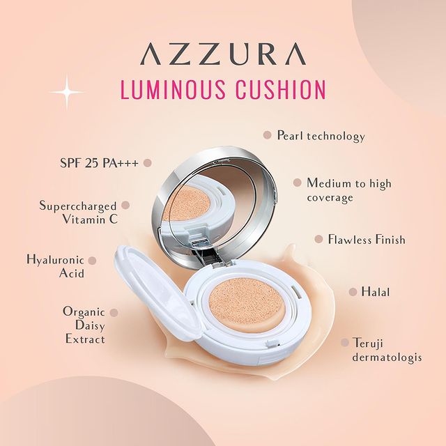 Manfaat amazonian clay bisa kamu dapatkan dengan menggunakan AZZURA Two Way Cake, AZZURA Compact Powder, dan AZZURA Loose Powder. Sementara kandungan Organic Daisy Extract terdapat pada AZZIRA Luminous Cushion. Kandungan ini bisa memberikan kelembutan dan juga mencerahkan, sehingga kulit kamu akan terlihat fresh sepanjang hari.