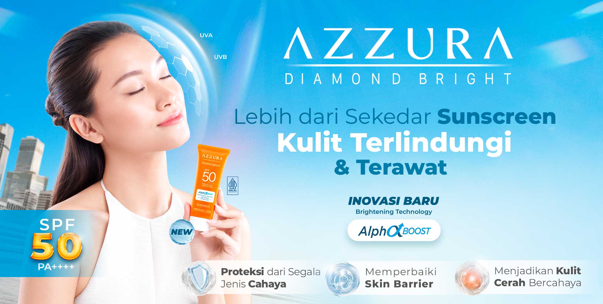 AZZURA Sunscreen Diamond Bright SPF 50 PA++++ & Blue Light Protection hadir sebagai solusi praktis untuk kamu yang ingin kulit tetap sehat, cerah, dan terlindungi sepanjang hari. Ditambah dukungan formula Alphaboost yang bisa mendukungmu mendapatkan kulit glass skin dalam 7 hari*! Jadi, nggak ada alasan lagi buat skip sunscreen atau malas reapply.